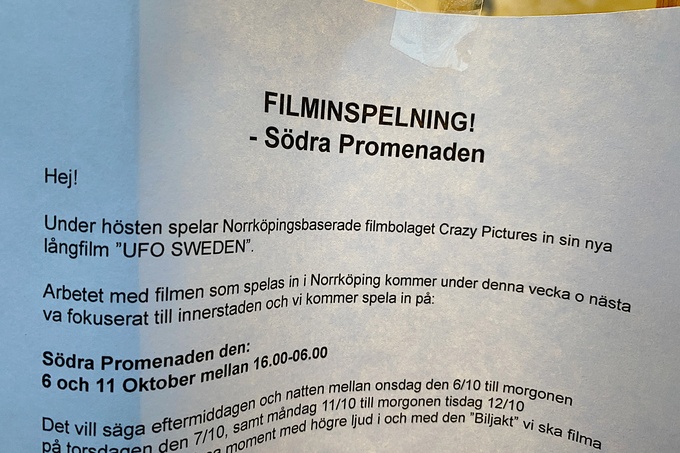 Nu i natt fram till morgonen 7 oktober 2021 varnas för höga ljud. Det fortsätter andra datum i centrala Norrköping under oktober. Det är aktiebolaget Crazy Pictures som ska tjäna pengar genom att göra en kalkonrulle om den vidskepliga sekten UFO-Sverige. De har redan tiggt sig till stora bidrag från så många håll och fonder de kunde för att göra filmen. De har döpt den till UFO Sweden för att kunna prångla ut den som julfilm över hela världen. Ska inte julfilmer innehålla, granar, tomte, änglar och julkrubba längre? Nu blir det i stället ufo och biljakter när det lilla Jesusbarnet får flytta på sig i biorepertoaren.