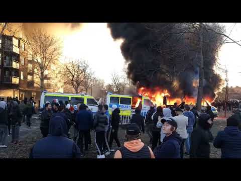 "Väldigt tumultartad", rapporterar P4 Örebros David Forsell på platsen samtidigt som bangers kastas mot polisen."