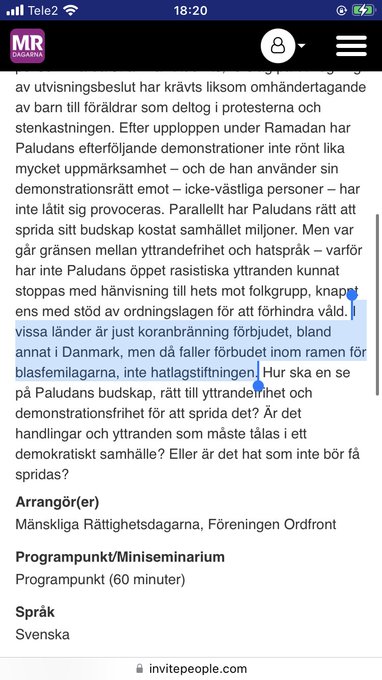 "Men var går gränsen mellan yttrandefrihet och hatspråk – varför har inte Paludans öppet rasistiska yttranden kunnat stoppas med hänvisning till hets mot folkgrupp, knappt ens med stöd av ordningslagen för att förhindra våld. I vissa länder är just koranbränning förbjudet, bland annat i Danmark, men då faller förbudet inom ramen för blasfemilagarna, inte hatlagstiftningen."
